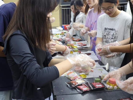 活动现场,同学们体验了中秋传统游戏“猜灯谜”。通过猜谜、解谜的方式,同学们深刻体会到中秋文化的传承。在制作月饼环节,同学们互相帮助、互相配合,亲手完成了样式多变、独具特色的中秋月饼。最后,现场的同学们还集体品尝了麻饼、薄脆和猪肉脯等泰州特色小吃。活动结束后,全体学生共同合影留念。