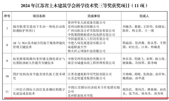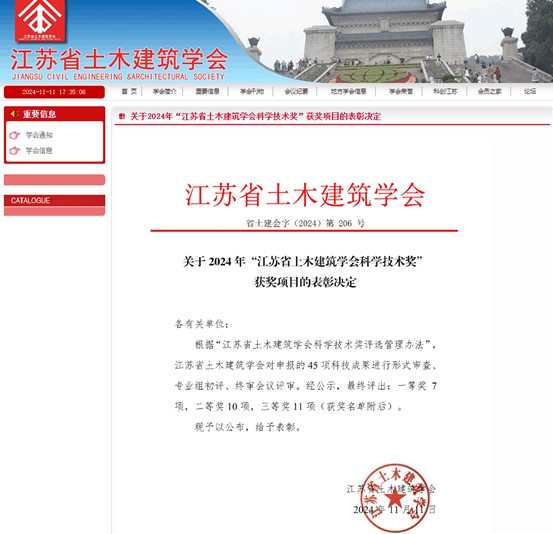 11月11日,江苏省土木建筑学会公布了《关于2024年“江苏省土木建筑学会科学技术奖”获奖项目的表彰决定》,我院与中国江苏国际经济技术合作集团有限公司合作的项目“三环组合国际大酒店复杂钢结构数字化建造成套技术”荣获三等奖。