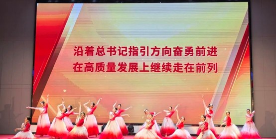 由我校师生编创的歌舞《走在前列》作为整场活动的开场参加了本次主题活动,瞬间点燃了现场的气氛。同学们以饱满的精神状态和精湛的舞艺,展现了新时代青年人的蓬勃朝气和奋发向上的精神风貌。他们的歌声如泉水般清澈嘹亮,舞姿如春风般轻盈飘逸,仿佛在向世人宣告:在中华民族伟大复兴的征程上,我们青年一代将勇立潮头,走在前列。同学们精彩的表演,赢得了观众的阵阵掌声和泰州市领导的赞赏。