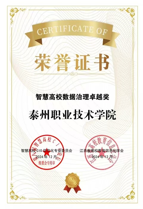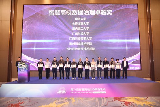 2024年12月5日,由智慧高校CIO组委会携手江西省高校教育信息化学会、上海市高等教育学会及东华理工大学共同举办的“第八届智慧高校CIO南昌论坛”在南昌圆满落幕。经过教育行业协会、媒体、咨询机构及会议执行委员会等多方专业人士组成的评审委员会的严格讨论、评议和投票,泰州职业技术学院在本届论坛上荣获“智慧高校数据治理卓越奖”。