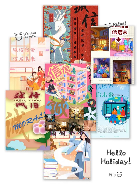 有的以简洁明了的设计风格,通过醒目的文字与形象的插画,直接传达出诚信的重要性。此次“诚信宿舍,信启未来”宿舍海报作品征集活动的成功举办,不仅丰富了艺术学院的校园文化生活,为学生们提供了一个展示才华与创意的平台,更将诚信理念深深地植入了学生们的心中。它以艺术为媒介,让诚信教育变得生动有趣、深入人心,激励着同学们在今后的生活中始终坚守诚信原则,共同营造和谐美好的校园环境,为艺术学院的文化建设增添了浓墨重彩的一笔。