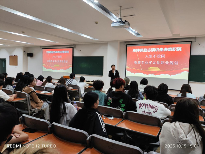 王钟葆作为经济与管理学院优秀毕业生,在电子商务领域深耕多年,现任泰州海陵区政协委员、泰州青年互联网营销师协会会长,在电子商务运营、市场推广等方面积累了丰富的实战经验。讲座中,他结合自身职业发展历程,从行业趋势、职业定位、技能提升等多个维度,为同学们提供了宝贵的建议和指导。