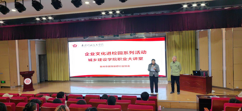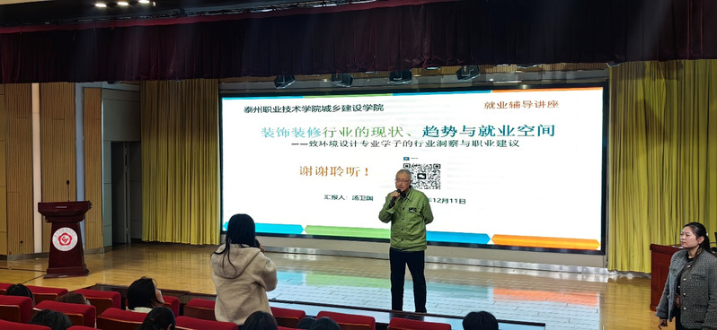 12月11日下午,泰州职业技术学院城乡建设学院在报告厅举办了一场主题为《装饰装修行业的现状、趋势与就业空间》的就业辅导讲座。本次讲座由行业专家汤卫国主讲,面向环境艺术设计专业大一、大二年级学生,旨在帮助学生拓宽行业视野、明确职业方向。