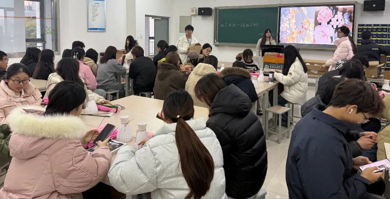 制作现场,同学们全情投入,指尖轻捻,将一缕缕丝绒塑造成花瓣与叶片。有的同学制作了简约雅致的梅花,寓意坚毅;有的则挑战了繁复华丽的福寿三多,寄托美好祝福。这个过程极其需要耐心与细心,也正因如此,所有的焦虑与杂念仿佛都被手中的丝绒悄然吸收、转化。大家沉浸在创造的愉悦中,享受着“心随丝动,意伴花成”的专注与平和。