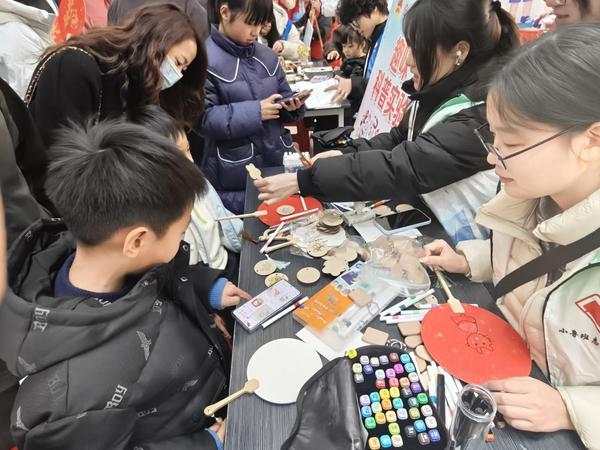 活动现场,学院志愿者发挥设计专业特长,为到场市民开展团扇、钥匙扣DIY手绘服务。家长与孩子携手参与,在志愿者帮助下,拿起画笔勾勒线条、填充色彩,将创意与巧思融入作品。创作过程趣味十足,现场氛围温馨热烈,既让大家体验到手作的乐趣,也在互动中拉近了彼此距离。