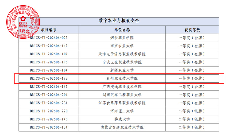 3月31日至4月3日,2026“一带一路”暨金砖国家技能发展与技术创新大赛之技术创新赛国内决赛在福建厦门圆满落幕。在“数字农业与粮食安全”这一重要赛道中,我校智能制药与化工新材料学院杨珊珊、燕韦婷、周琳、沙赟颖、刘竺云五名教师组成的参赛团队荣获全国一等奖(金牌)。