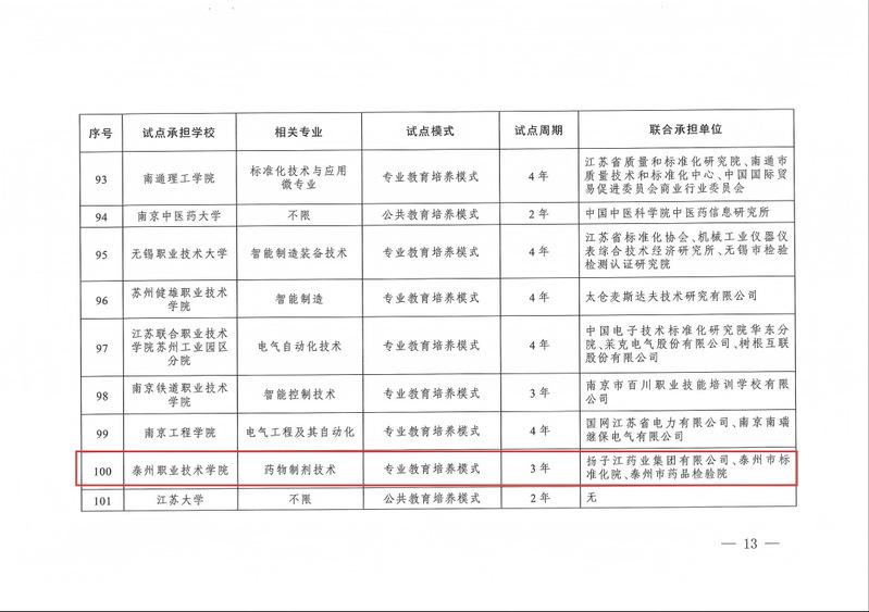 本次试点在江苏省市场监督管理局的指导与推荐下,以我校智能制药与化工新材料学院为基础,联合扬子江药业集团有限公司、泰州市标准化院、泰州市药品检验院共同申报。试点采用“专业教育培养模式”,建设周期为3年(2026—2028年),旨在推动制药类专业与标准化教育深度融合,培养“精专业、懂标准、能实践”的高素质复合型技术技能人才。