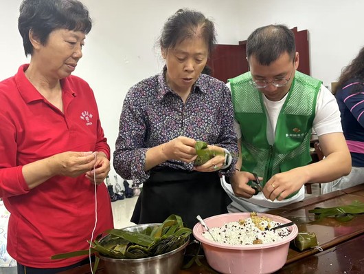 活动伊始,由泰州颐养中心工作人员为社区退休人员进行了新型养老生活模式的介绍,传播了更为健康科学的退休生活新范式。随后,志愿者们将提前准备好的粽叶、糯米、蜜枣、红豆等食材和工具摆上桌,和老人们围在一起,一边学习包粽子的技巧,一边分享着端午的故事和生活趣事。从最初的手忙脚乱到逐渐熟练,老人们脸上洋溢着满满的成就感和喜悦之情。