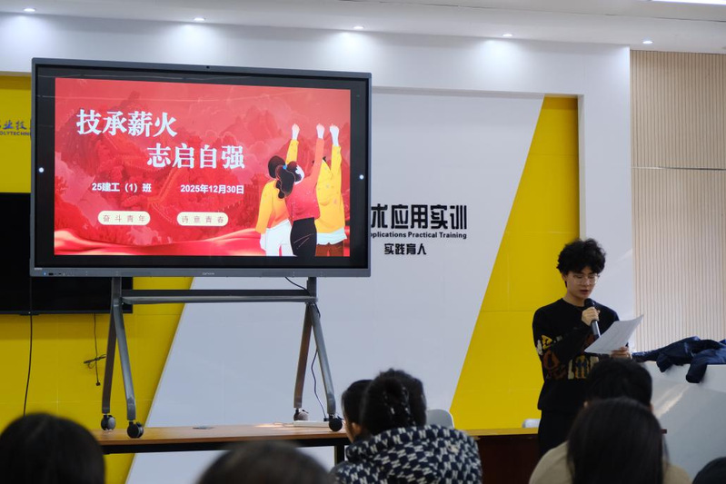 12月30日下午,城建院25建工(1)班于学院一楼汇报厅成功举办“技承薪火 志启自强”校级主题班会。师生齐聚一堂,通过光影展示、榜样分享、互动交流等丰富形式,共同感悟自强内涵,凝聚前行力量。