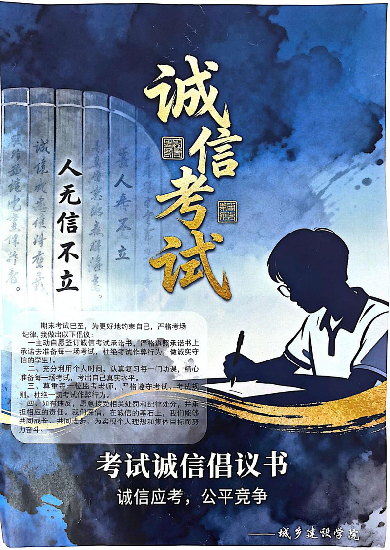 临近期末,为进一步加强校园诚信教育,引导学生树立诚信立身、诚信治学的良好风尚,同时充分发挥城乡建设学院学生在设计、绘画等方面的专业优势,近日,城乡建设学院精心组织开展了“诚信伴我行”主题海报设计活动,以艺术创作的形式传递诚信理念,为校园注入浓厚的诚信文化氛围。